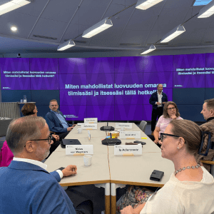 Tämä inspiroiva ja ajatuksia ravisteleva keskustelutilaisuus johtajuuden ja luovuuden suhteesta suomalaisessa päätöksentekoketjussa järjestettiin Aalto EE:n tiloissa.